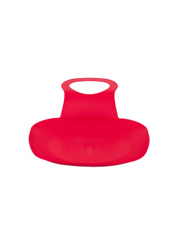 Trenó de plástico com dois travões manuais para paragem e controlo de direção e cordão com pega plástica para transporte facilitado.